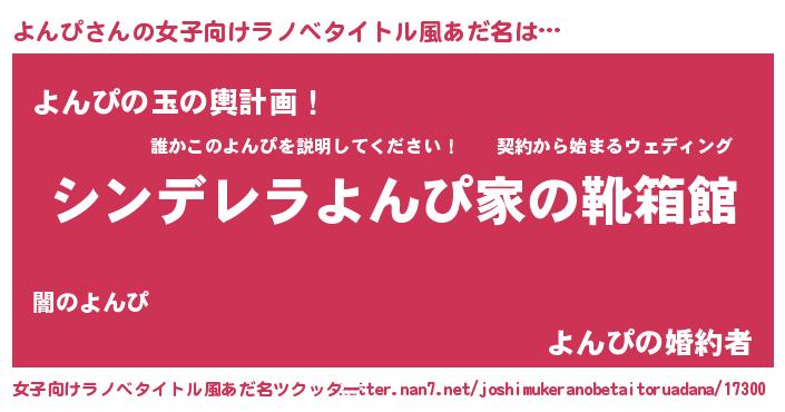 | 男性向けラノベタイトル風あだ名 | 『冴えないよんぴの育てかた』 |