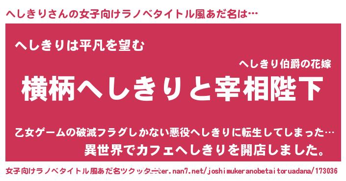 | 男性向けラノベタイトル風あだ名 | 『へしきりに滅ぼされるだけの簡単なお仕事です』 |