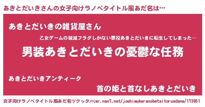 あきとだいきさんの女子向けラノベタイトル風あだ名は… 『男装あきとだいきの憂鬱な任務』『あきとだいきの雑貨屋さん』『首の姫と首なしあきとだいき』 ツクッター #女子向けラノベタイトル風あだ名ツクッター http://tkutter.nan7.net/joshimukeranobetaitoruadana/173051/