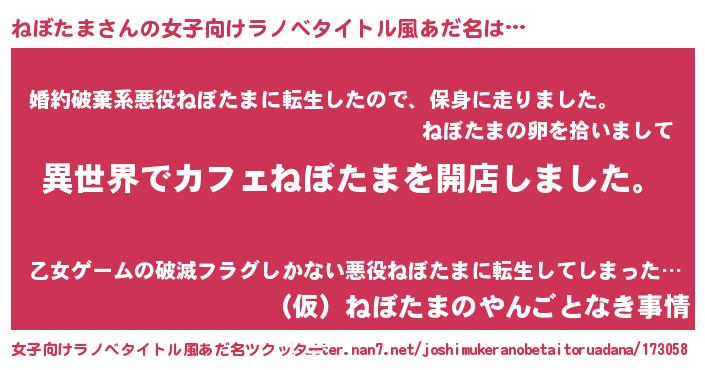 | 胡散臭い通販商品みたいなあだ名 | 『前代未聞の健康食品…その名も「ねぼたま」』 |