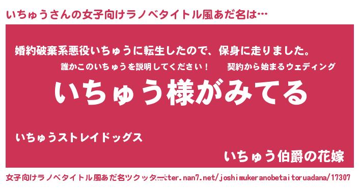 | 男性向けラノベタイトル風あだ名 | 『いちゅうの嫁は女の子じゃないと思った?』 |
