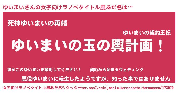 | 男性向けラノベタイトル風あだ名 | 『ゆいまい~年齢イコール彼女いない歴の魔法使い~』 |
