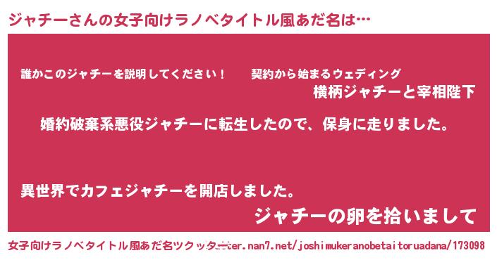 | 胡散臭い通販商品みたいなあだ名 | 『必ず成功するブレスレット…その名も「ジャチー」』 |