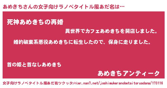 | 男性向けラノベタイトル風あだ名 | 『アメキチスレイヤー』 |
