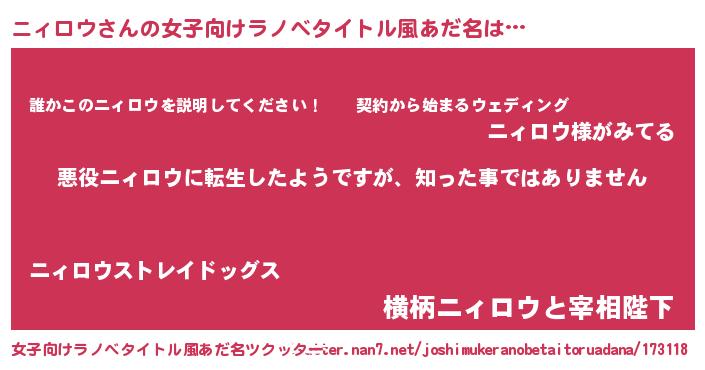 | 男性向けラノベタイトル風あだ名 | 『この素晴らしい世界にニィロウを!』 |