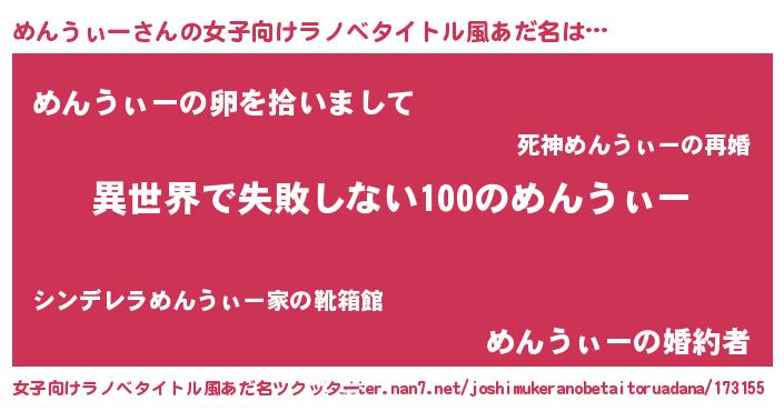 | 男性向けラノベタイトル風あだ名 | 『めんうぃーという概念が存在しない退屈な世界 』 |
