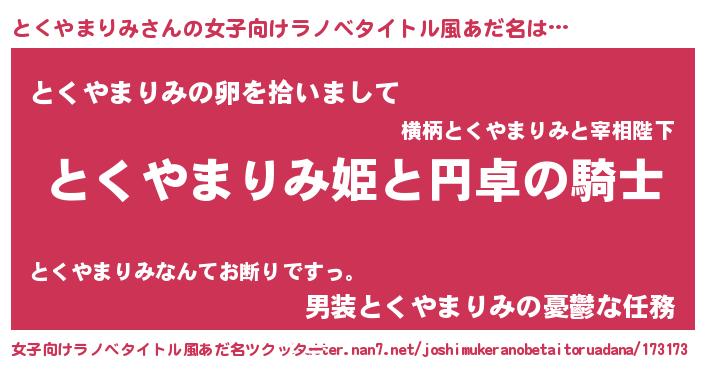 とくやまりみさんの女子向けラノベタイトル風あだ名は… 『とくやまりみ姫と円卓の騎士』『とくやまりみの卵を拾いまして』『男装とくやまりみの憂鬱な任務』 ツクッター #女子向けラノベタイトル風あだ名ツクッター http://tkutter.nan7.net/joshimukeranobetaitoruadana/173173/
