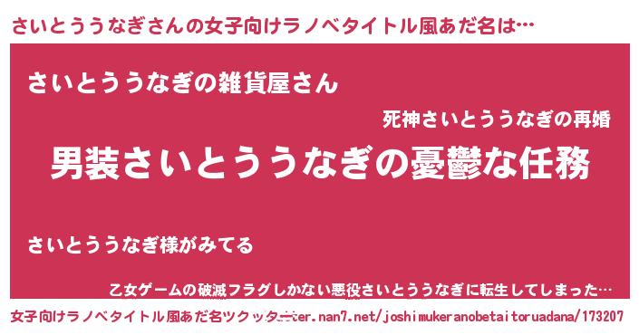 | 男性向けラノベタイトル風あだ名 | 『うちのさいとううなぎが世界を掌握している!』 |