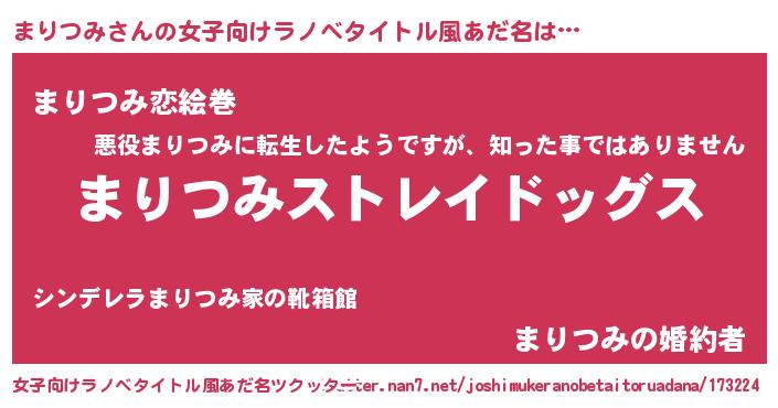 | 男性向けラノベタイトル風あだ名 | 『Re:まりつみから始める異世界生活』 |