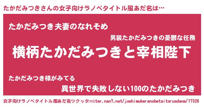 | 男性向けラノベタイトル風あだ名 | 『たかだみつきに滅ぼされるだけの簡単なお仕事です』 |