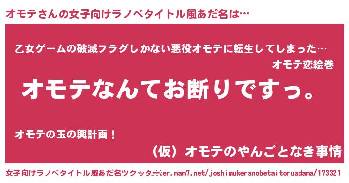 オモテさんの女子向けラノベタイトル風あだ名は… 『オモテなんてお断りですっ。』『乙女ゲームの破滅フラグしかない悪役オモテに転生してしまった…』『(仮)オモテのやんごとなき事情』 ツクッター #女子向けラノベタイトル風あだ名ツクッター http://tkutter.nan7.net/joshimukeranobetaitoruadana/173321/