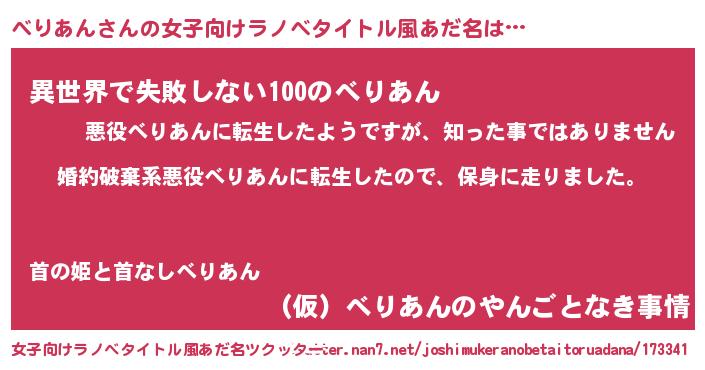 | 男性向けラノベタイトル風あだ名 | 『転生したらべりあんだった件』 |