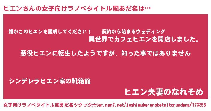 | 男性向けラノベタイトル風あだ名 | 『この素晴らしい世界にヒエンを!』 |