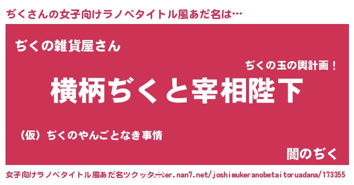ぢくさんの女子向けラノベタイトル風あだ名は… 『横柄ぢくと宰相陛下』『ぢくの雑貨屋さん』『闇のぢく』 ツクッター #女子向けラノベタイトル風あだ名ツクッター http://tkutter.nan7.net/joshimukeranobetaitoruadana/173355/