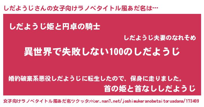 しだようじさんの女子向けラノベタイトル風あだ名は… 『異世界で失敗しない100のしだようじ』『しだようじ姫と円卓の騎士』『首の姫と首なししだようじ』 ツクッター #女子向けラノベタイトル風あだ名ツクッター http://tkutter.nan7.net/joshimukeranobetaitoruadana/173409/