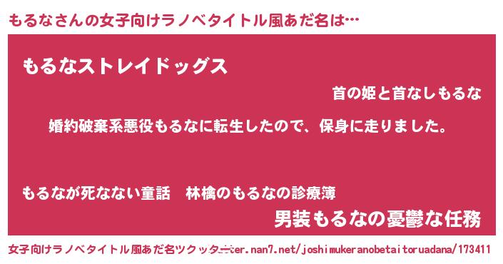 | 男性向けラノベタイトル風あだ名 | 『転生したらもるなだった件』 |