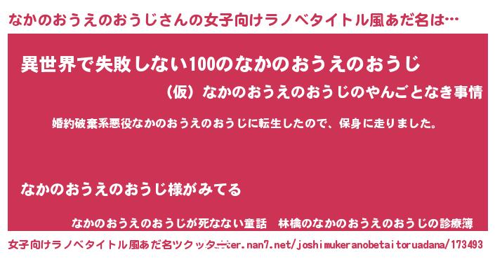 | 男性向けラノベタイトル風あだ名 | 『転生したらなかのおうえのおうじだった件』 |