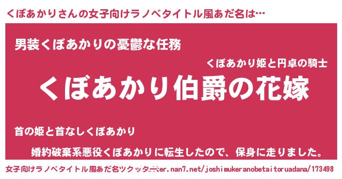 | 男性向けラノベタイトル風あだ名 | 『うちの娘の為ならば、俺はもしかしたらくぼあかりも倒せるかもしれない。』 |