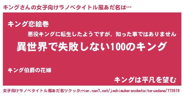 | 男性向けラノベタイトル風あだ名 | 『キングという概念が存在しない退屈な世界 』 |