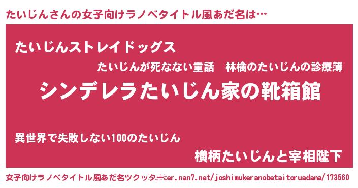 | 男性向けラノベタイトル風あだ名 | 『冴えないたいじんの育てかた』 |