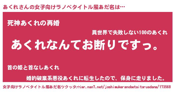 | 意味不明あだ名 | 『自称あくれ』『眠気覚ましガムあくれ味』 |