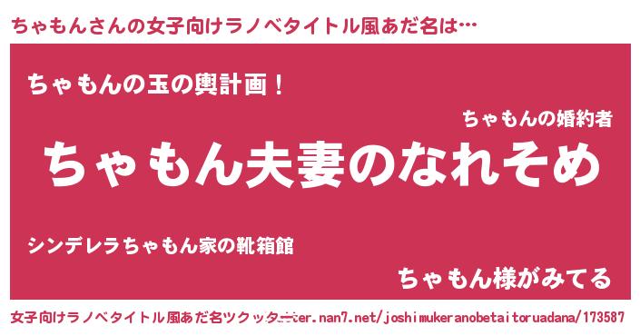 | 男性向けラノベタイトル風あだ名 | 『おまえをオタクにしてやるから、俺をちゃもんにしてくれ! 』 |