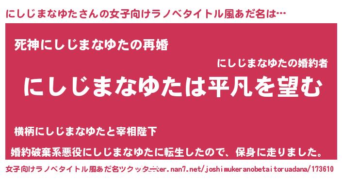 | 男性向けラノベタイトル風あだ名 | 『ダンジョンににしじまなゆたを求めるのは間違っているだろうか』 |
