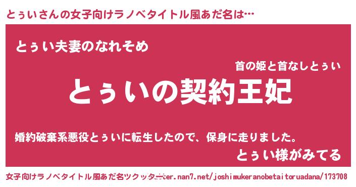 | 男性向けラノベタイトル風あだ名 | 『とぅいという概念が存在しない退屈な世界 』 |