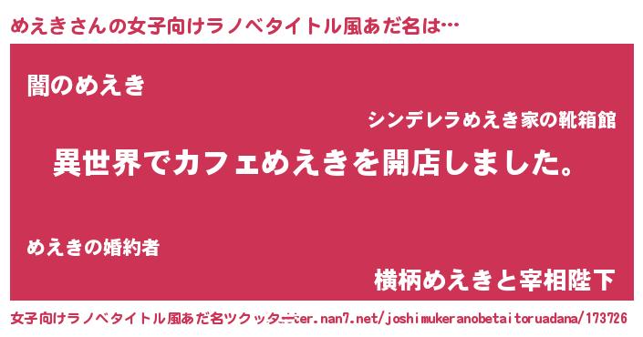 | 男性向けラノベタイトル風あだ名 | 『誰もが恐れるあのめえきが、ぼくの専属メイドになるようです。』 |
