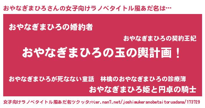 | 男性向けラノベタイトル風あだ名 | 『おやなぎまひろ~年齢イコール彼女いない歴の魔法使い~』 |