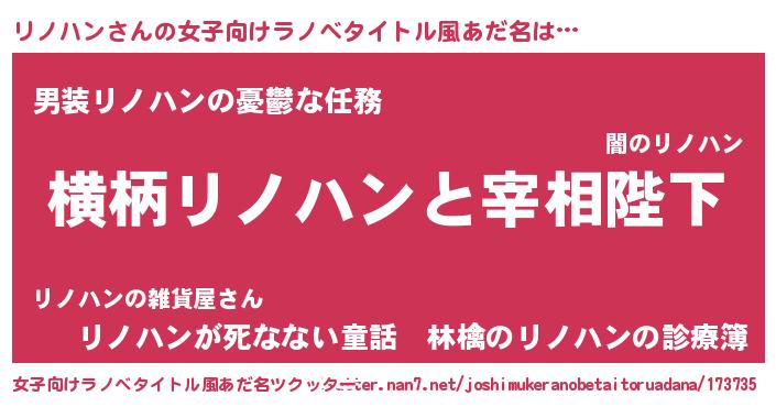| 男性向けラノベタイトル風あだ名 | 『リノハンに滅ぼされるだけの簡単なお仕事です』 |