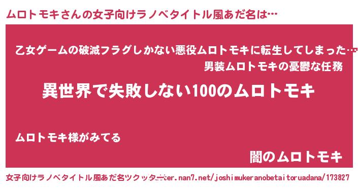 | 男性向けラノベタイトル風あだ名 | 『ムロトモキという概念が存在しない退屈な世界 』 |