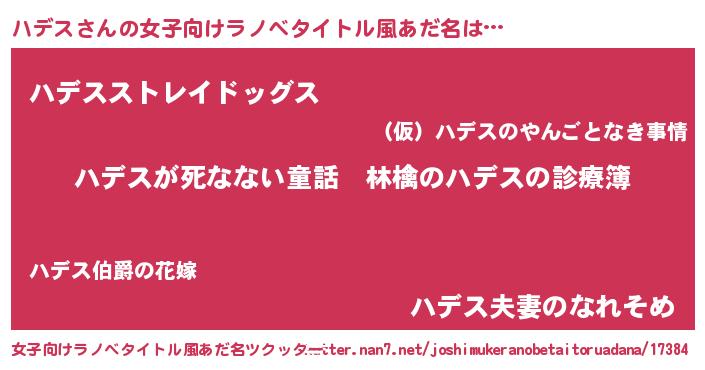 | 男性向けラノベタイトル風あだ名 | 『魔弾の王とハデス』『ハデスの憂鬱』 |