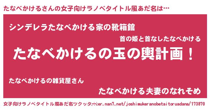 | 男性向けラノベタイトル風あだ名 | 『たなべかける~年齢イコール彼女いない歴の魔法使い~』 |