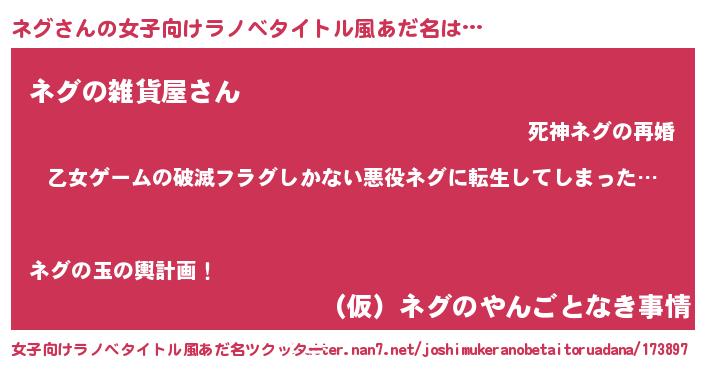 | 男性向けラノベタイトル風あだ名 | 『この素晴らしい世界にネグを!』 |