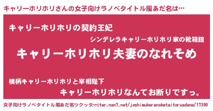 キャリーホリホリさんの女子向けラノベタイトル風あだ名は… 『キャリーホリホリ夫妻のなれそめ』『キャリーホリホリの契約王妃』『キャリーホリホリなんてお断りですっ。』 ツクッター #女子向けラノベタイトル風あだ名ツクッター http://tkutter.nan7.net/joshimukeranobetaitoruadana/17390/