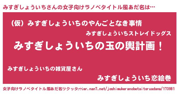 | 男性向けラノベタイトル風あだ名 | 『みすぎしょういち~年齢イコール彼女いない歴の魔法使い~』 |