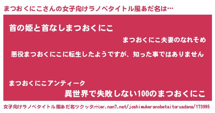 | 男性向けラノベタイトル風あだ名 | 『この素晴らしい世界にまつおくにこを!』 |