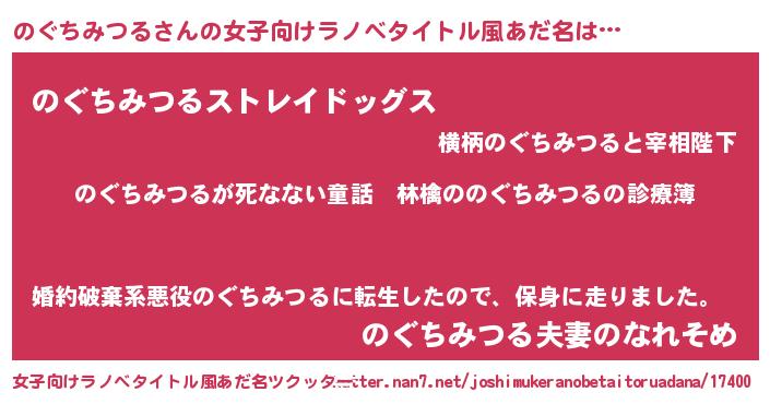 | 男性向けラノベタイトル風あだ名 | 『魔弾の王とのぐちみつる』 |