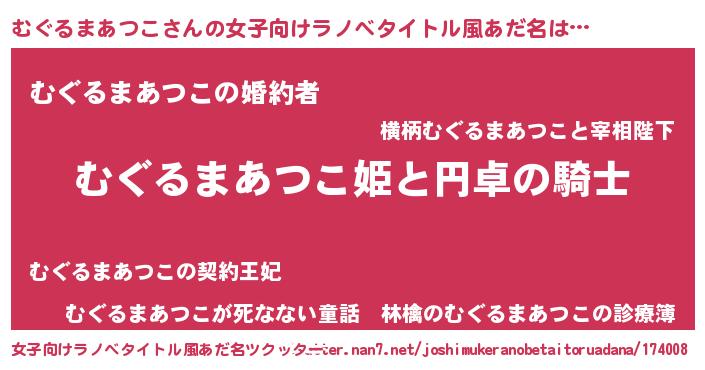 | 男性向けラノベタイトル風あだ名 | 『むぐるまあつこの憂鬱』 |