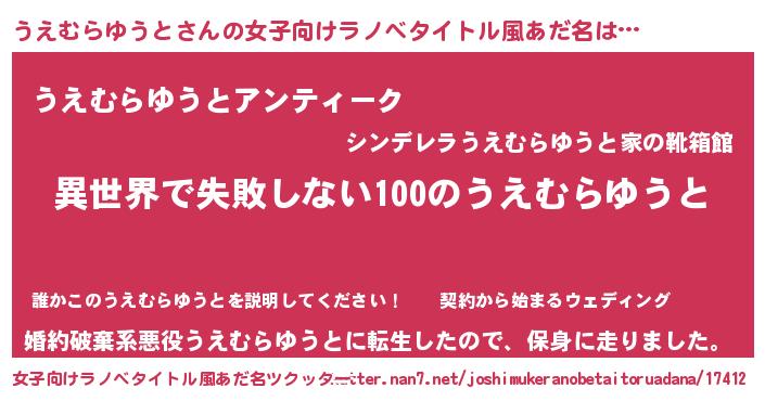 | 胡散臭い通販商品みたいなあだ名 | 『絶対に幸福をもたらす水素水…その名も「うえむらゆうと」』 |