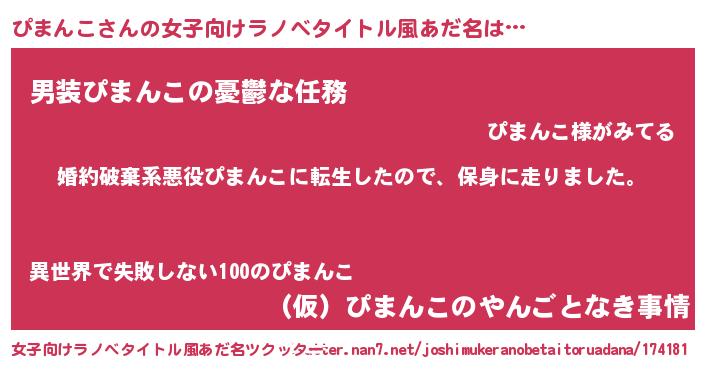 | 男性向けラノベタイトル風あだ名 | 『転生したらぴまんこだった件』 |