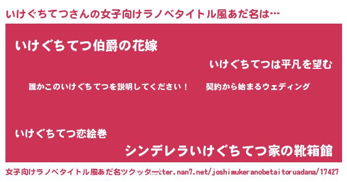 | 男性向けラノベタイトル風あだ名 | 『イケグチテツアートオンライン』 |
