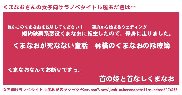 | 男性向けラノベタイトル風あだ名 | 『魔弾の王とくまなお』 |