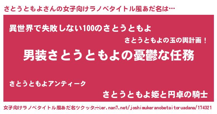 | 男性向けラノベタイトル風あだ名 | 『冴えないさとうともよの育てかた』 |