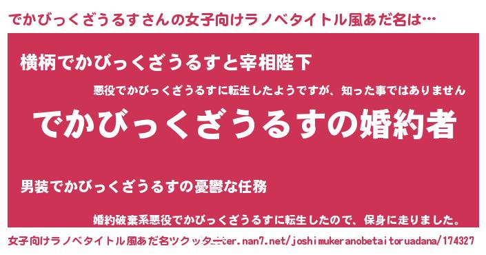| 男性向けラノベタイトル風あだ名 | 『うちの娘の為ならば、俺はもしかしたらでかびっくざうるすも倒せるかもしれない。』 |