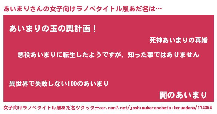 | 男性向けラノベタイトル風あだ名 | 『この素晴らしい世界にあいまりを!』 |