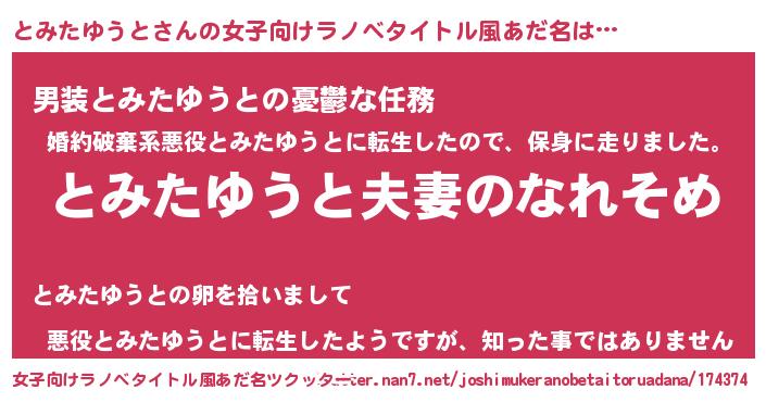 | 男性向けラノベタイトル風あだ名 | 『おまえをオタクにしてやるから、俺をとみたゆうとにしてくれ! 』 |
