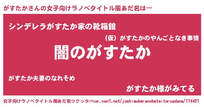 | 男性向けラノベタイトル風あだ名 | 『Re:がすたかから始める異世界生活』 |