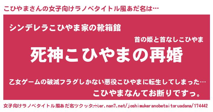 こひやまさんの女子向けラノベタイトル風あだ名は… 『死神こひやまの再婚』『シンデレラこひやま家の靴箱館』『こひやまなんてお断りですっ。』 ツクッター #女子向けラノベタイトル風あだ名ツクッター http://tkutter.nan7.net/joshimukeranobetaitoruadana/174442/